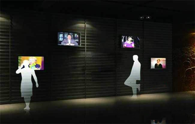 觀眾看到墻面上多個顯示設(shè)備中,每個顯示畫面中都有人物的視頻靜止影像。每臺電視下都有一個控制按鈕(可以是自動感應(yīng)器),當(dāng)觀眾按到其中一個時(shí)(當(dāng)自動感應(yīng)器撲捉有人接近 ……